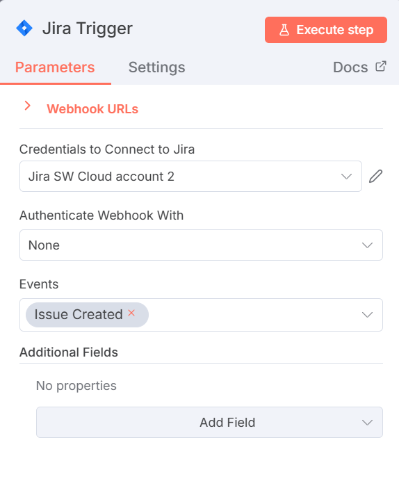 Under Jira node tree, select the “On issue created” node and set the parameters. Refer to the below image for the setting to be done.