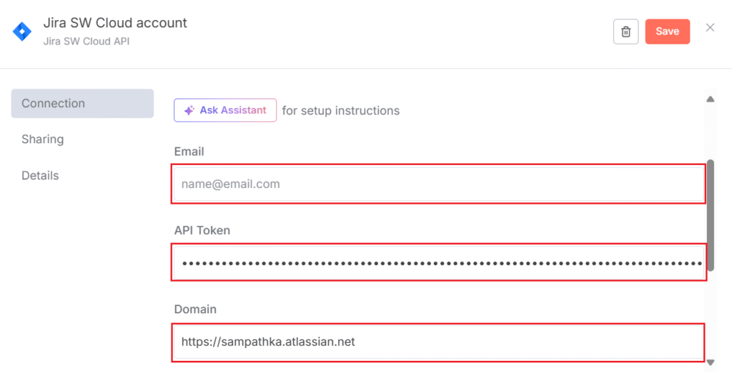Under parameters, in the “Credentials to Connect to Jira” section, select the “Create new credential” and specify the details as displayed in the next window that appears, i.e, email id, API token and domain in order to connect your node to your Jira account.