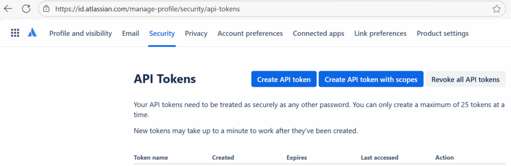 For the API token, login to your Jira account and navigate to Account settings > Security > API tokens and click on “Create and manage API tokens” which will take you to the below screen. Create your API token and paste it to the section as in the above image along with the domain information ,i.e, “https://sampathka.atlassian.net/” in our scenario. Finally, click on Save button and you are done with the setting to connect your Jira account to your node.