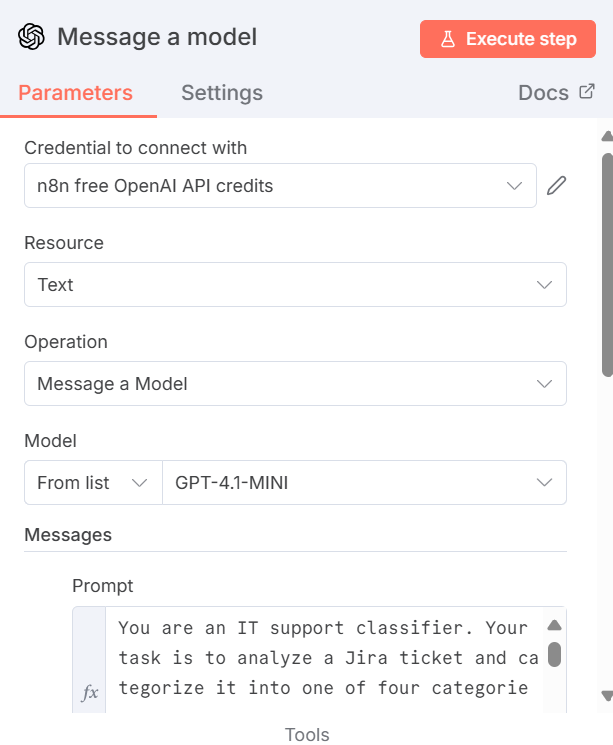 Since we are done with the setting for the above node, next we will click on the + icon at the top right and search for the next node. Under OpenAI node tree, select the “Message a model” node and set the parameters as shown in the image below.