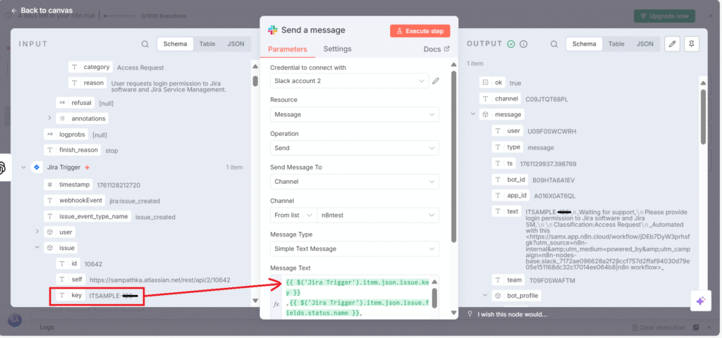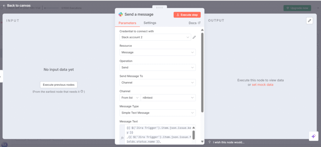 The above JSON under Message Text can also be set by dragging the output of Jira trigger node as shown below. The input and output sections will be visible once you execute the step/workflow.
