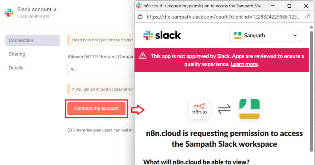 On parameter setting screen of the above node, you need to connect to a Slack account using the “Create new credential” option under “Credential to connect with” section. In the next screen, click on the Connect my account button and your Slack node will be connected to your Slack account (Slack account 2 used in this example).