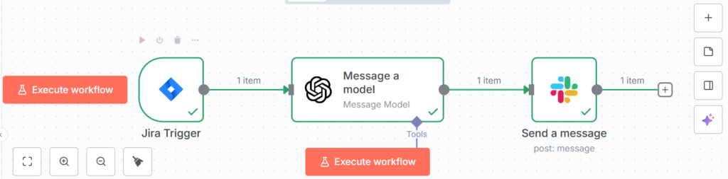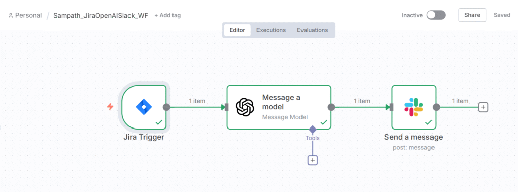 In order to overcome the inefficiencies, we will design a workflow that will have the Jira SM, OpenAI LLM and Slack nodes. Jira SM form entry and submission from a user will be the trigger to start the workflow. Open AI LLM will be the action node that will perform the action of segregation to respective team based on the system prompt provided in the node. Finally, the slack node will receive the data from Open AI LLM node and display it in the channel specified.