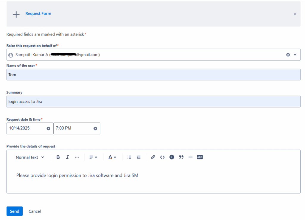The workflow is not yet complete ,i.e, you need to have a trigger to start the workflow. For this, we will use the forms feature in JiraSM that will automatically generate a ticket once the form is submitted by a user. Inorder to create a form you can refer to my other blog here. The form user interface will appear as follows. The users can submit their service requests using the following form.