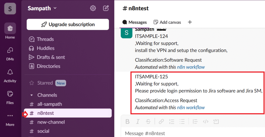 Since our workflow is connected to a Slack channel, we will have to check the appropriate channel(n8ntest) for the output message. You can see the latest JiraSM ticket number, followed by the status of the ticket, description and the classification of the ticket into a category for the appropriate team to take necessary action.