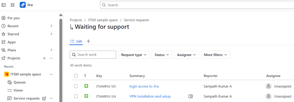 Inorder to check the workflow, click on the “Execute workflow” button at the centre as shown in the three node connected workflow above. The workflow will not wait for the form to be submitted by a user. Submit the form by inputting all the sections as shown above and click on the Send button. This will generate a ticket (ITSAMPLE-125) on JiraSM that will appear as follows.