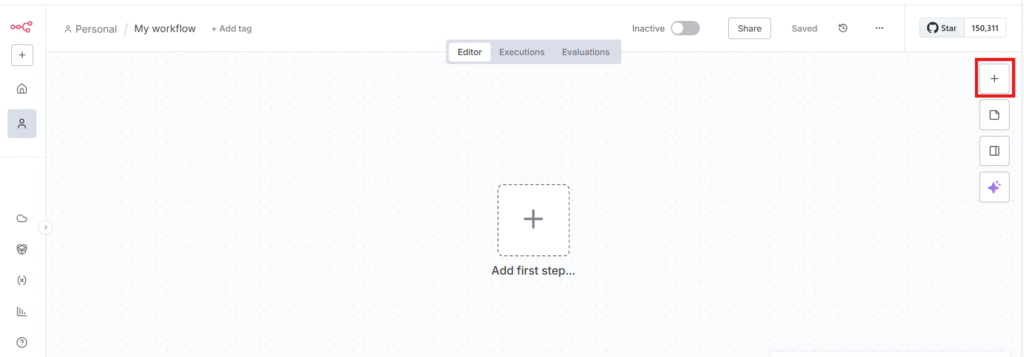 On the top right-hand side click the + icon, which indicates the “Open nodes panel” wherein we can search for the nodes to be inserted to our workflow.