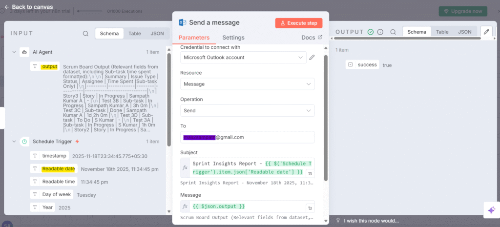 In this final node ,i.e, Send a message node present under Microsoft Outlook node tree, we will first connect to our outlook or hotmail account using the credentials. Once the connection is done, set the Resource, Operation, To, Subject and Message sections appropriately. The Subject section will be the subject of the report mail to be sent. It will consist of the text “Sprint Insights Report” followed by the date and time. The Message section will consist of the output of the AI Agent node.