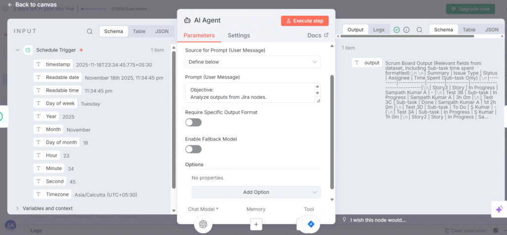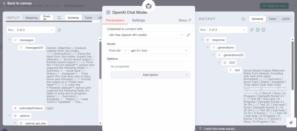 Each of the above nodes need to be connected to this AI Agent node as shown in the above workflow diagram. The prompt section (prompt text file attached below) needs to be input with the appropriate prompt so that the node requests the necessary information to each of the Jira nodes. The outputs from each of the Jira nodes will be further analysed using the OpenAI chat model node. Finally, the formatted output will be sent to the Outlook node that is mentioned in the next section.