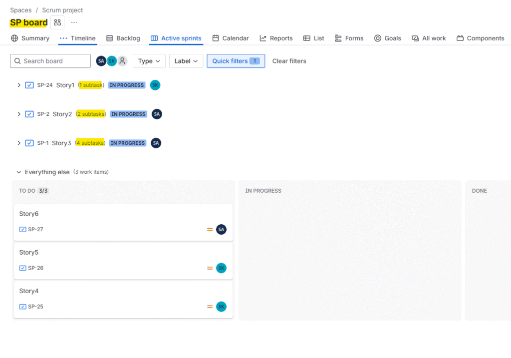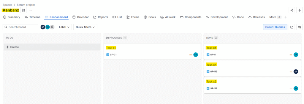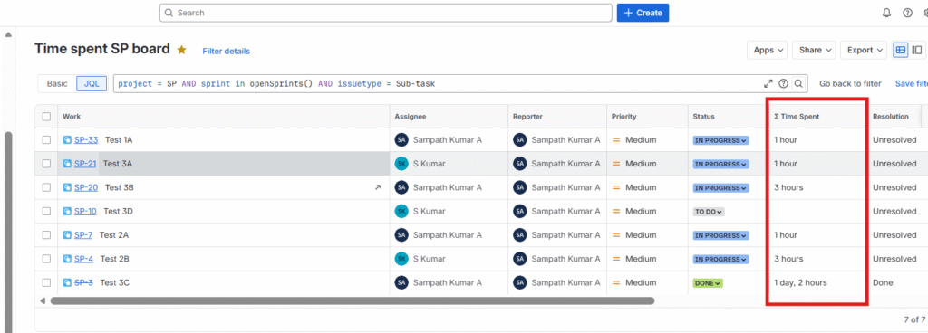 Now that we have got the report mail with information that is insightful, we can cross-verify the Story/Task/Subtask Summary or names, Assignee and Statuses from each of the Jira Scrum and Kanban boards directly for the correctness of data. Find the screenshot of the Jira Scrum board, Kanban board, Time Spent filter as follows. For the lead time part, refer to the above report “Kanban Board Output” section.