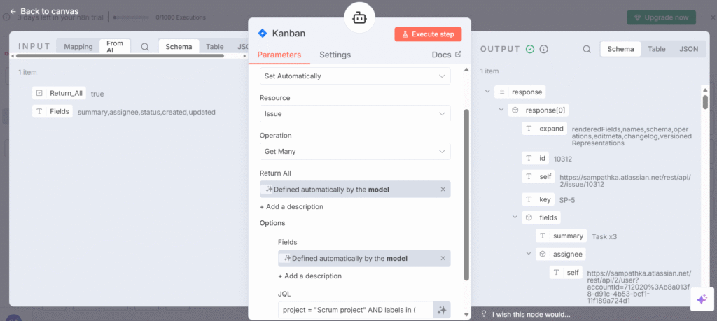The next node too is the “Jira Software Tool” node. Here, as we are extracting the data from a Kanban board, the following JQL can be used to extract all the issue types from the kanban board with labels “test”. The node name has been renamed to Kanban from the default name. You can refer to the input section in the node below to check the requested information from AI Agent node.