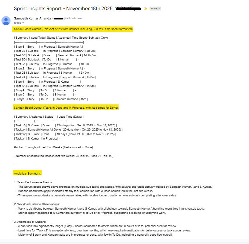 Automating the tracking and reporting of Scrum or Kanban KPIs can eliminate the constant manual effort required to create and maintain filters, dashboards in tools like Jira. Instead of relying on regularly updating the filter & gadgets, a fully automated system can pull the right data at the right time, package key metrics such as lead time, throughput, sprint progress, and kanban board work-in-progress trends, along with the insights and send them directly to your inbox on a recurring schedule. This ensures teams always have accurate, timely insights without any dashboard upkeep, thus enabling faster decision-making, greater transparency, and continuous improvement with minimal overhead.
