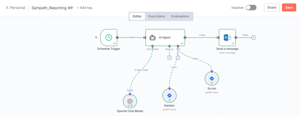 You can refer to the following workflow to implement the automation using n8n tool. The workflow consists of the Schedule Trigger node, OpenAI Chat Model node, Jira nodes for each of the Scrum and Kanban boards, the Outlook node to send a message and the controller node,i.e, the AI Agent node which controls the whole workflow.