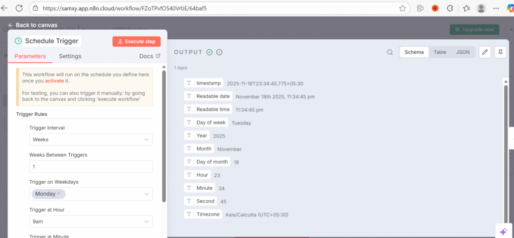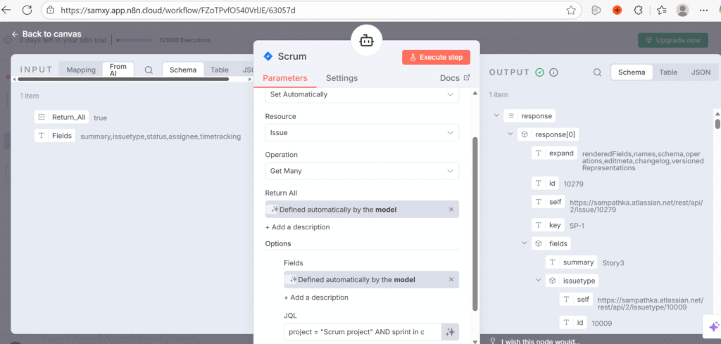 The Schedule trigger node can be set to trigger the workflow based on the length of the sprint. In my previous blog, i had explained on how to navigate to select a node. For our scenario, the node is set to trigger the workflow once a week, i.e., on Monday at 9AM. In case of a 2-week sprint, we can get to know the status mid-sprint and at the end of the sprint.